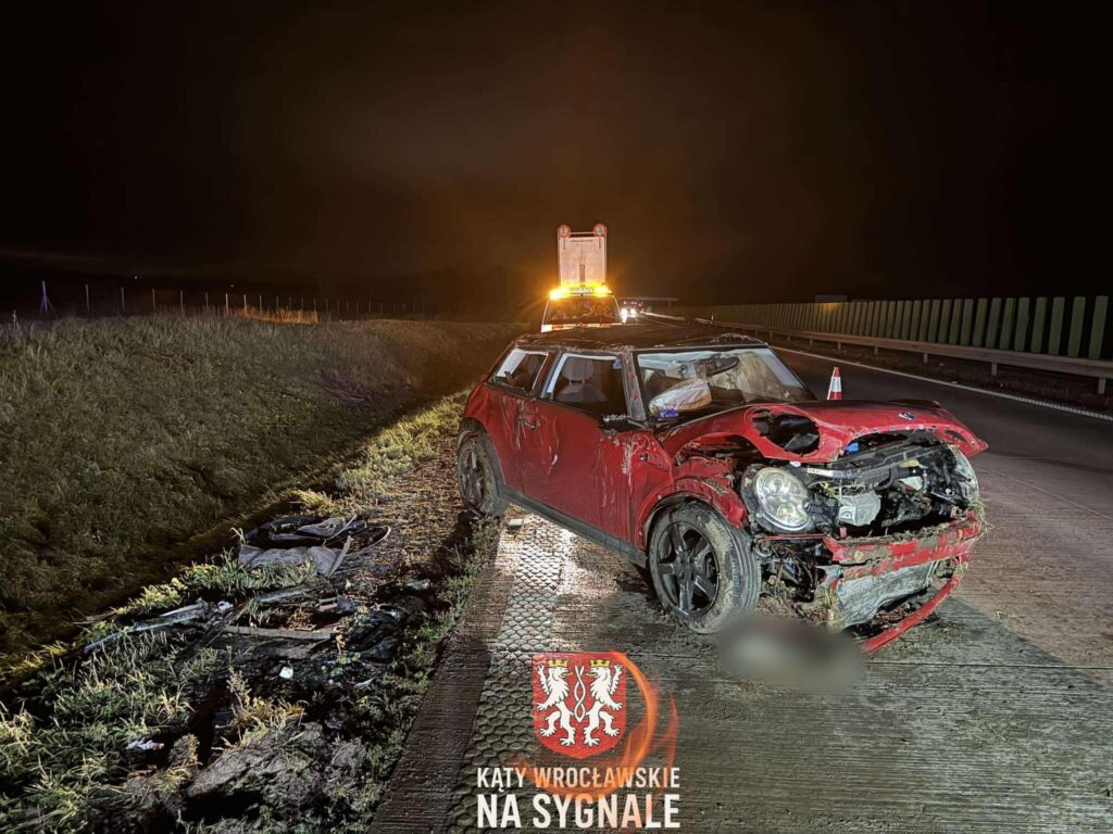 O godzinie 23:55 doszło do dachowania samochodu osobowego marki Mini. Kierujący z nieokreślonej przyczyny zjechał na pobocze, wpadł do rowu i dachował. Na miejscu pracowały zastępy Straży Pożarnej oraz patrol Policji z Wydziału Ruchu Drogowego tzw Ogniwo Wypadkowe. Utrudnienia na 145 kilometrze Autostrady A4 występowały do godziny 02:20- ubezpieczalnia przez prawie 2 godziny nie była w stanie zorganizować pomocy drogowej Assistance więc uczestnik zdarzenia zdecydował się na wezwanie pomocy drogowej na własny koszt.