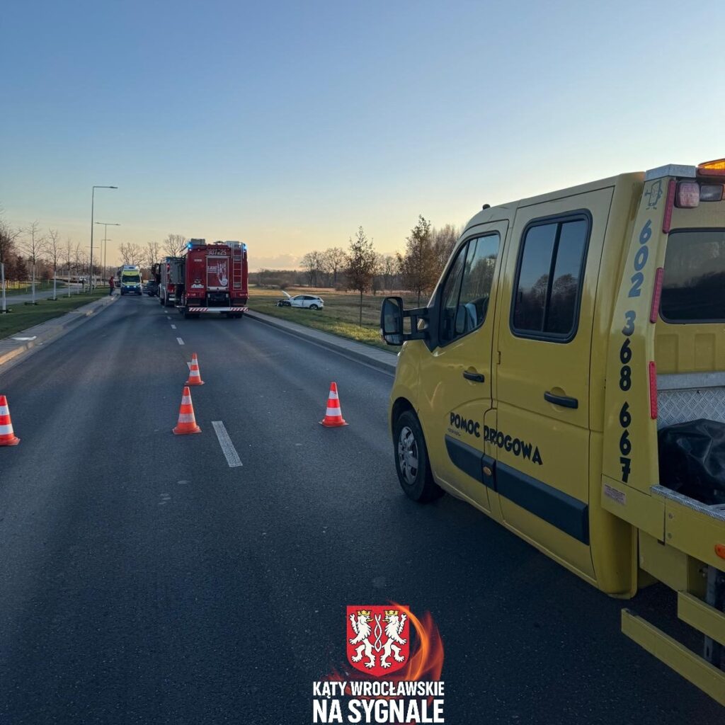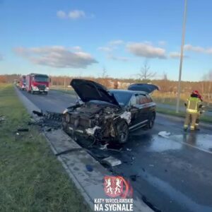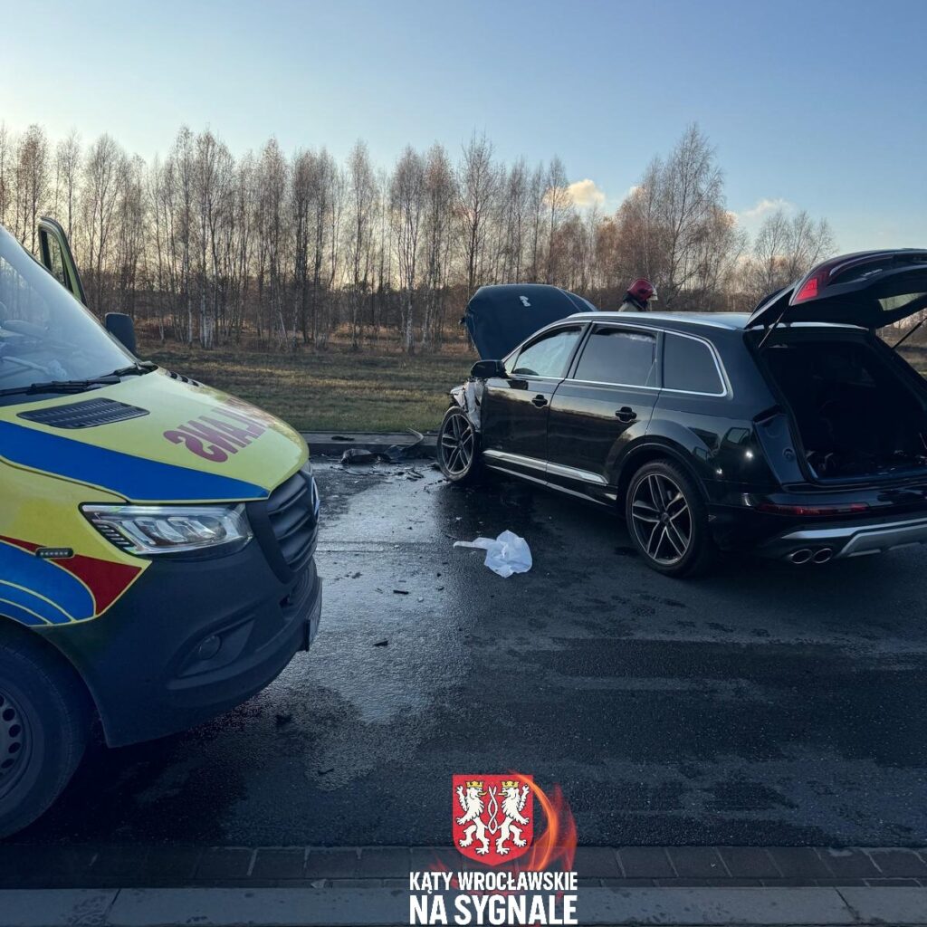 Wypadek- zderzenie czołowe z udziałem dwóch samochodów osobowych, Audi oraz Nissana. Na miejscu pracują zastępy Straży Pożarnej oraz Zespoły Ratownictwa Medycznego. Mamy w tym zdarzeniu osoby poszkodowane. Trwa oczekiwanie na przyjazd patrolu Policji z Wydziału Ruchu Drogowego. Droga jest zablokowana w obydwóch kierunkach.