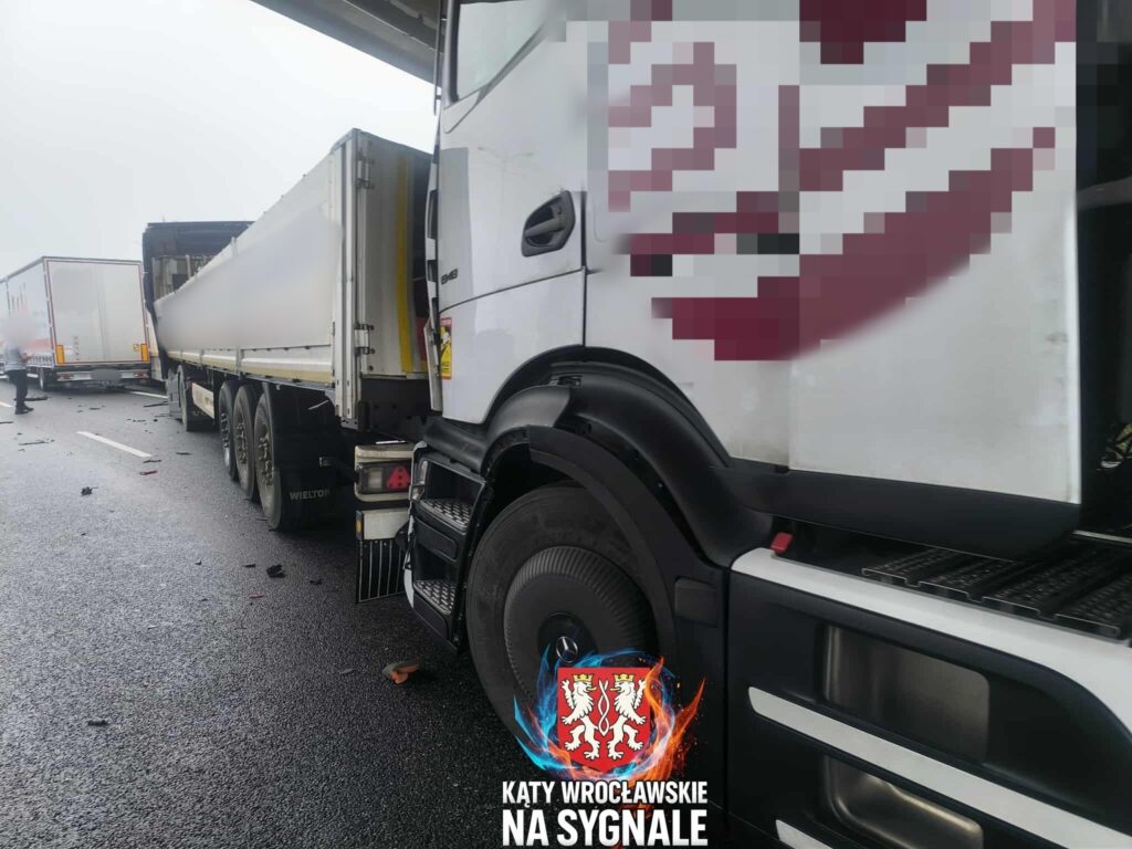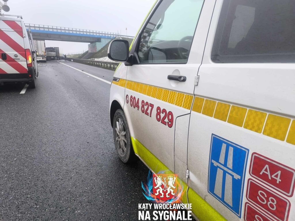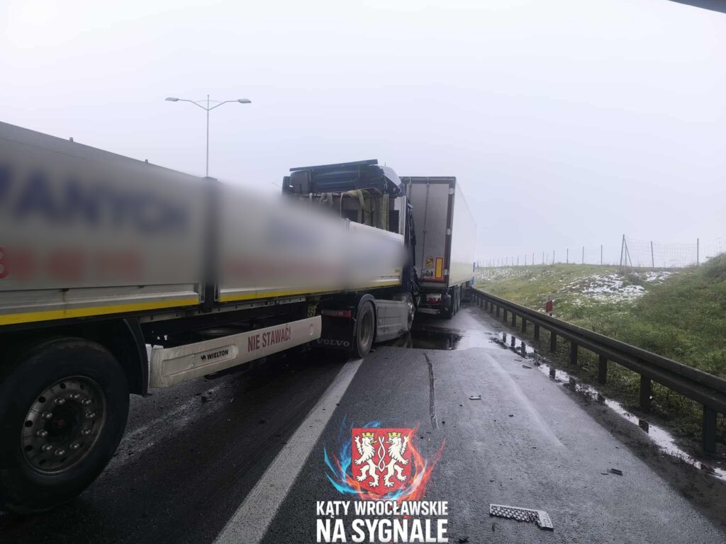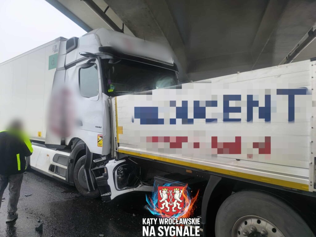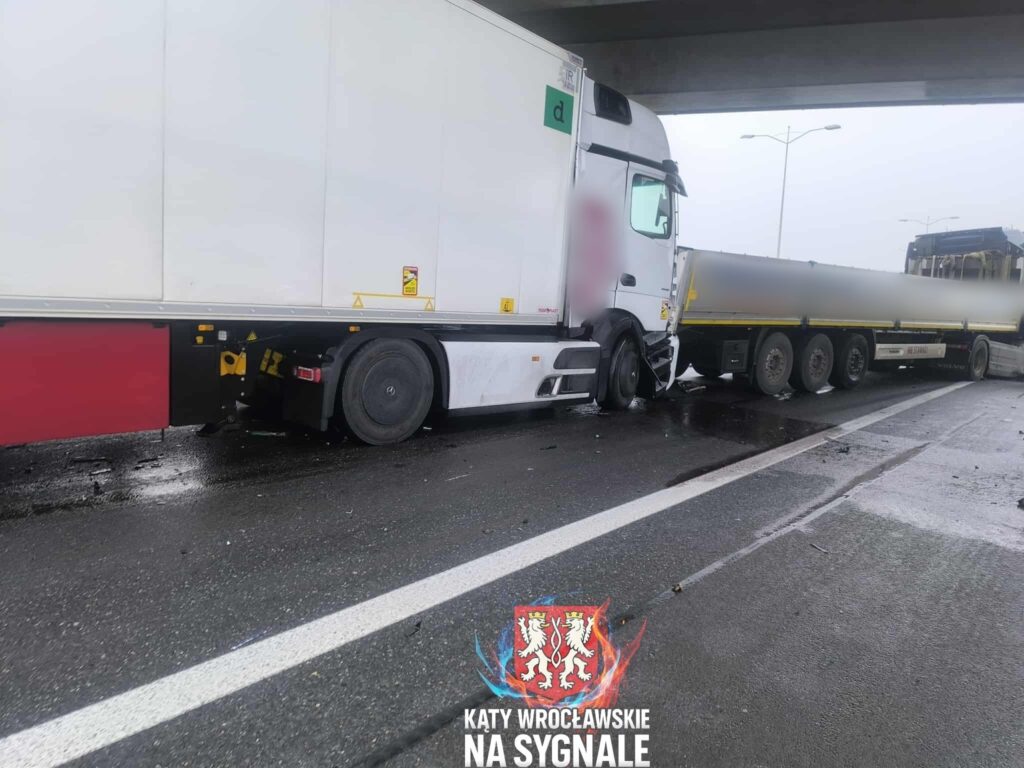 Na Autostradowej Obwodnicy Wrocławia doszło dziś do poważnego zdarzenia drogowego. Na 7. kilometrze trasy, tuż przed węzłem Wrocław Południe, na jezdni w kierunku Kudowy-Zdroju, zderzyły się aż cztery pojazdy ciężarowe. W wyniku karambolu dwa z trzech pasów ruchu zostały całkowicie zablokowane.