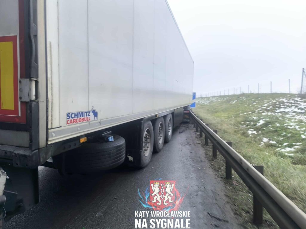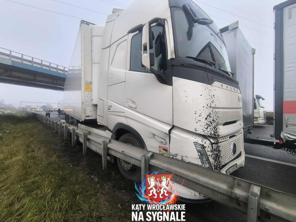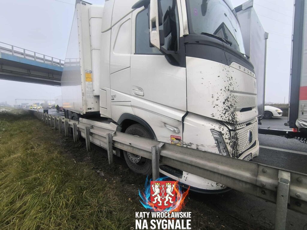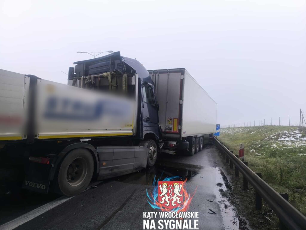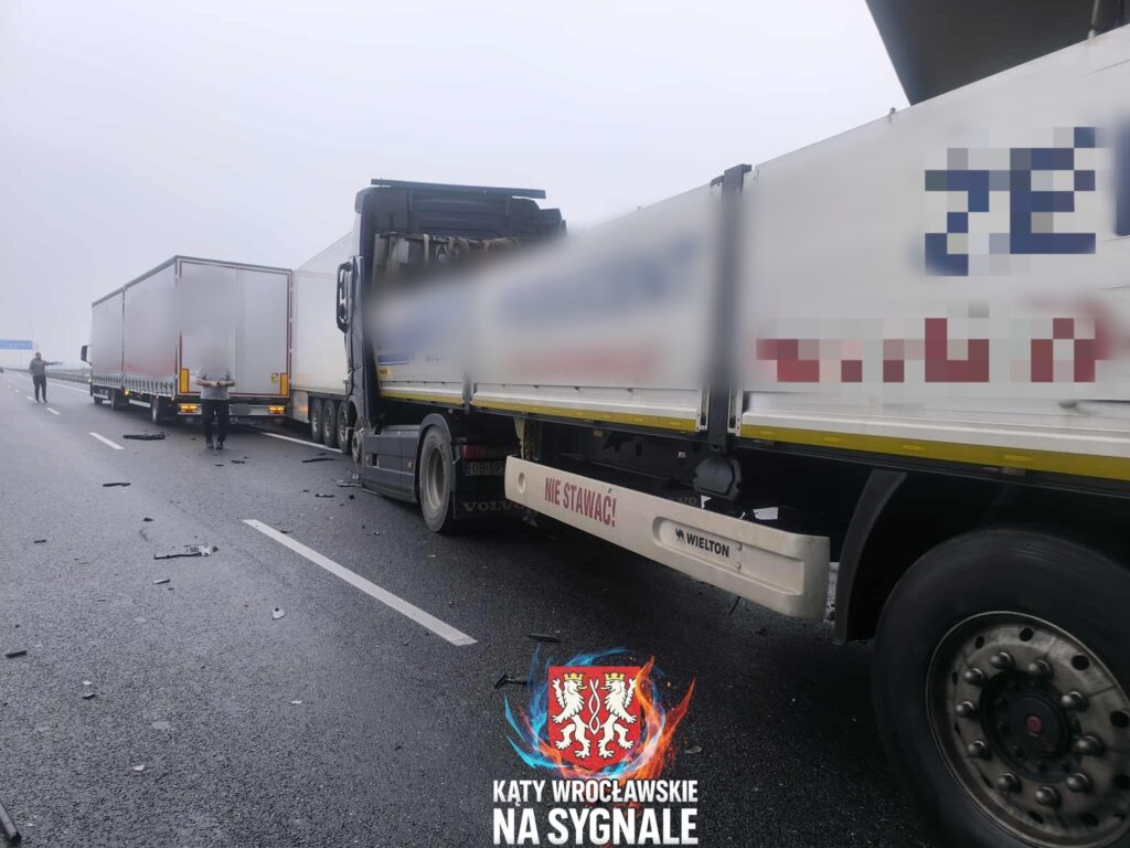 Na Autostradowej Obwodnicy Wrocławia doszło dziś do poważnego zdarzenia drogowego. Na 7. kilometrze trasy, tuż przed węzłem Wrocław Południe, na jezdni w kierunku Kudowy-Zdroju, zderzyły się aż cztery pojazdy ciężarowe. W wyniku karambolu dwa z trzech pasów ruchu zostały całkowicie zablokowane.
