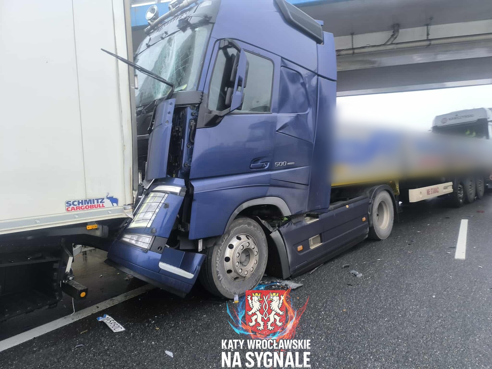 Karambol na AOW. Cztery ciężarówki zderzyły się przed węzłem Wrocław Południe.